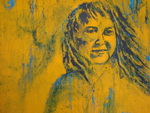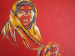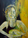 2006Vrouw met djembe; gemaakt tegelijk met 2 andere schilderijen van vrouwen. De achtergrondkleuren lopen in elkaar over, horen bij elkaar, maar komen apart ook goed tot hun recht. Met blank houten baklijst.