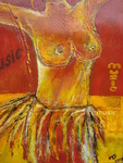 2009Afrikaanse vrouw (torso) , dansend om een vuur, aardekleuren, dichtbij de natuur. De beweging zichtbaar, "bestempeld" met muziek. Dit doek wordt omlijst door een handgemaakte zwaar houten lijst.