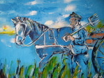 2009Een oud West Fries tafereeltje; een boer met paardenkar. Schilderij ontstaan n.a.v. een krantenknipseltje. Gemaakt voor een landbouwtentoonstelling.