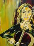 2006Vrouw met cello; gemaakt tegelijk met 2 andere schilderijen met vrouwen. De achtergrondkleuren lopen in elkaar over. Horen bij elkaar, maar komen apart ook goed tot hun recht. Met blank houten baklijst.