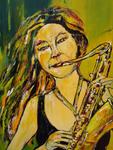 2006Vrouw met saxofoon, gemaakt tegelijk met 2 andere schilderijen met vrouwen. De achtergrondkleuren lopen in elkaar over, horen bij elkaar, maar komen apart ook goed tot hun recht. Met blank houten baklijst.